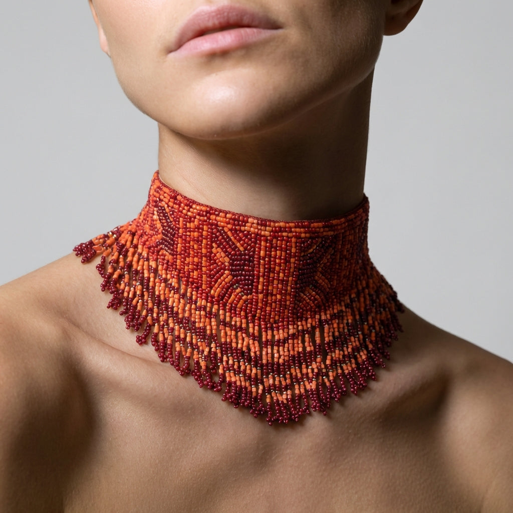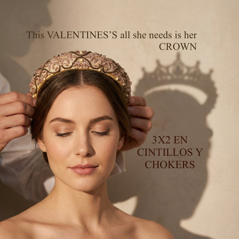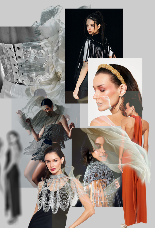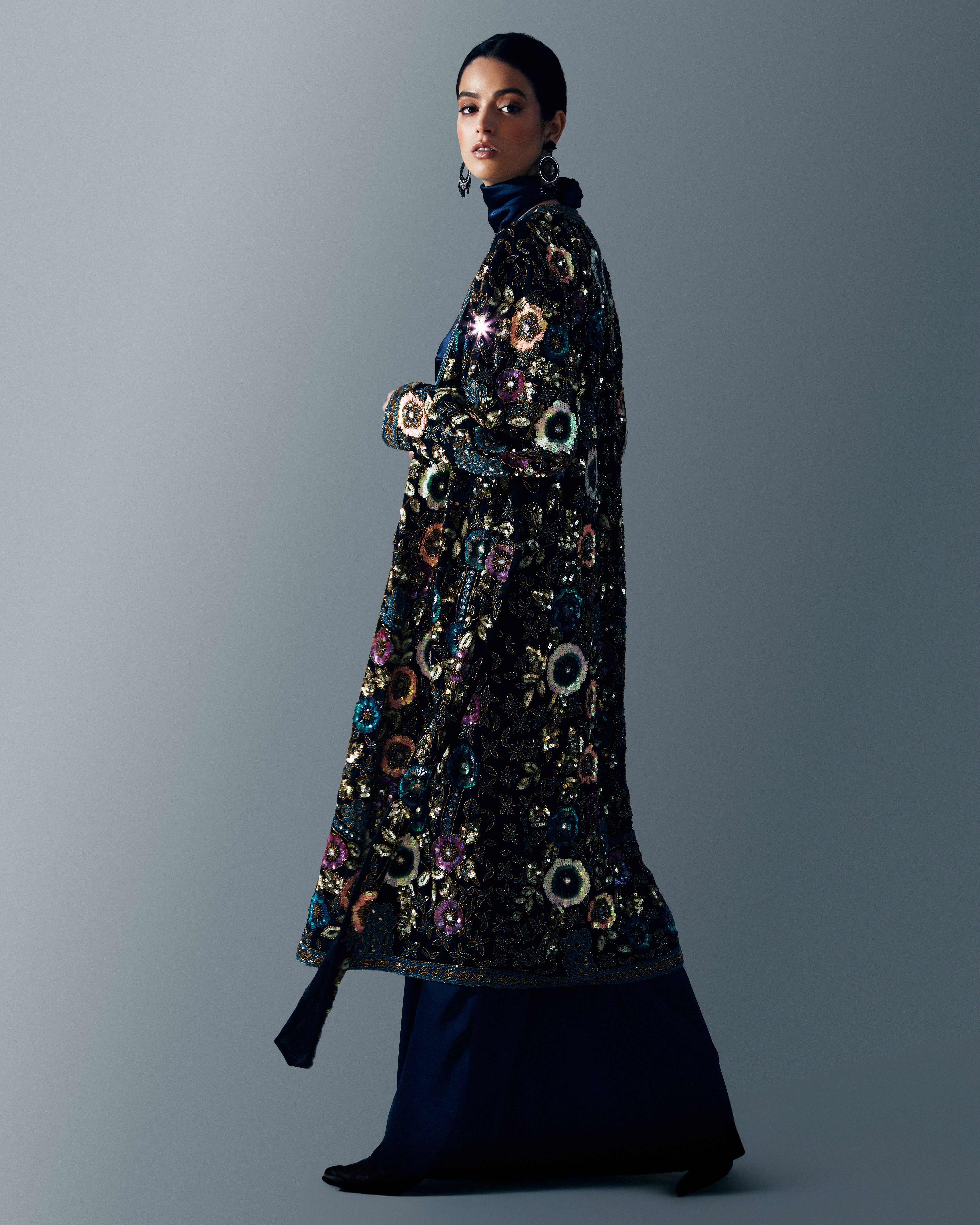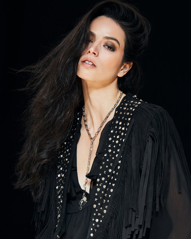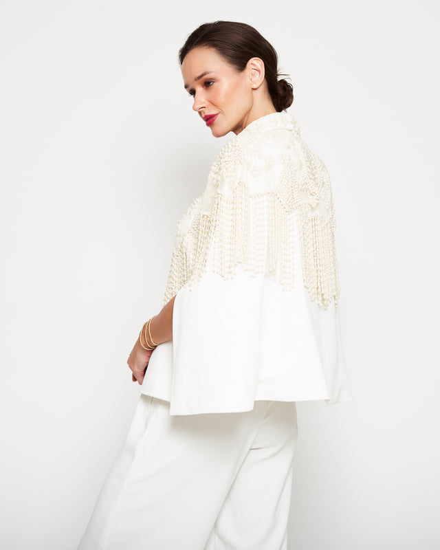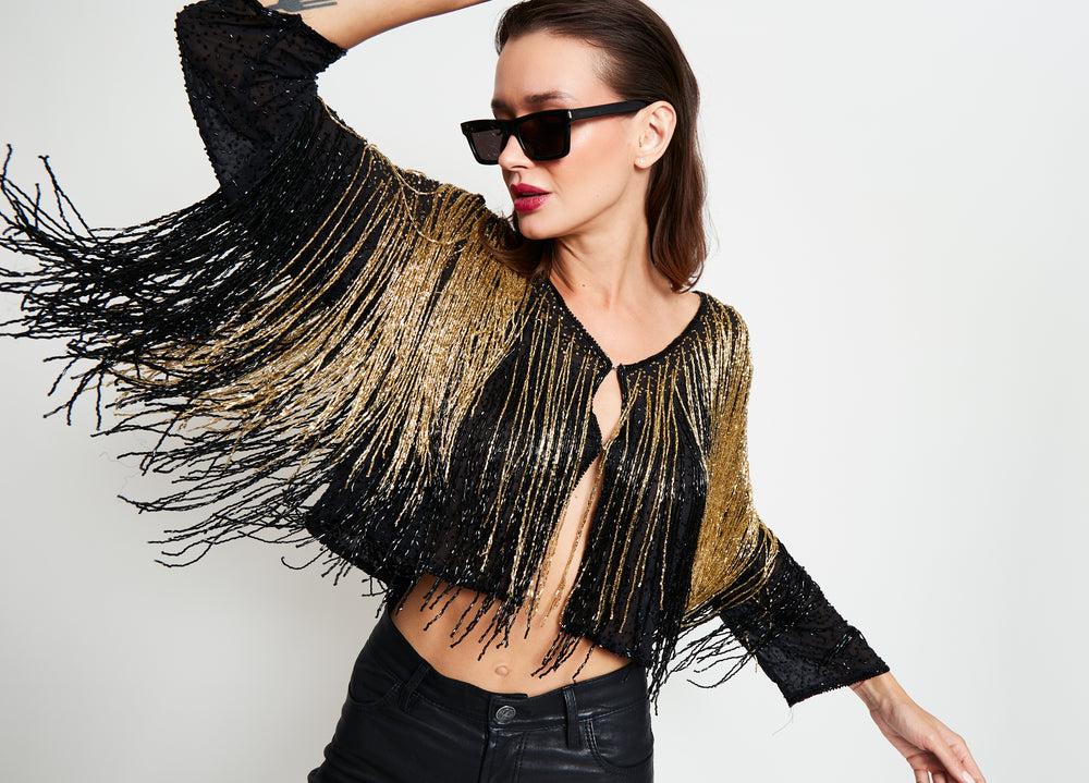 Capa artesanal bordada a mano con pedrería plateada sobre base de tul negro y formas paisley que se despliegan como un verdadero tapiz de lujo. Su silueta corta se realza con largas cascadas de mostacillas y flecos de cristal que caen desde los hombros y el contorno, aportando movimiento y brillo en cada paso. El cuello alto bordado en pedrería completa una pieza imponente, pensada para transformar un vestido simple en un look de alta costura.