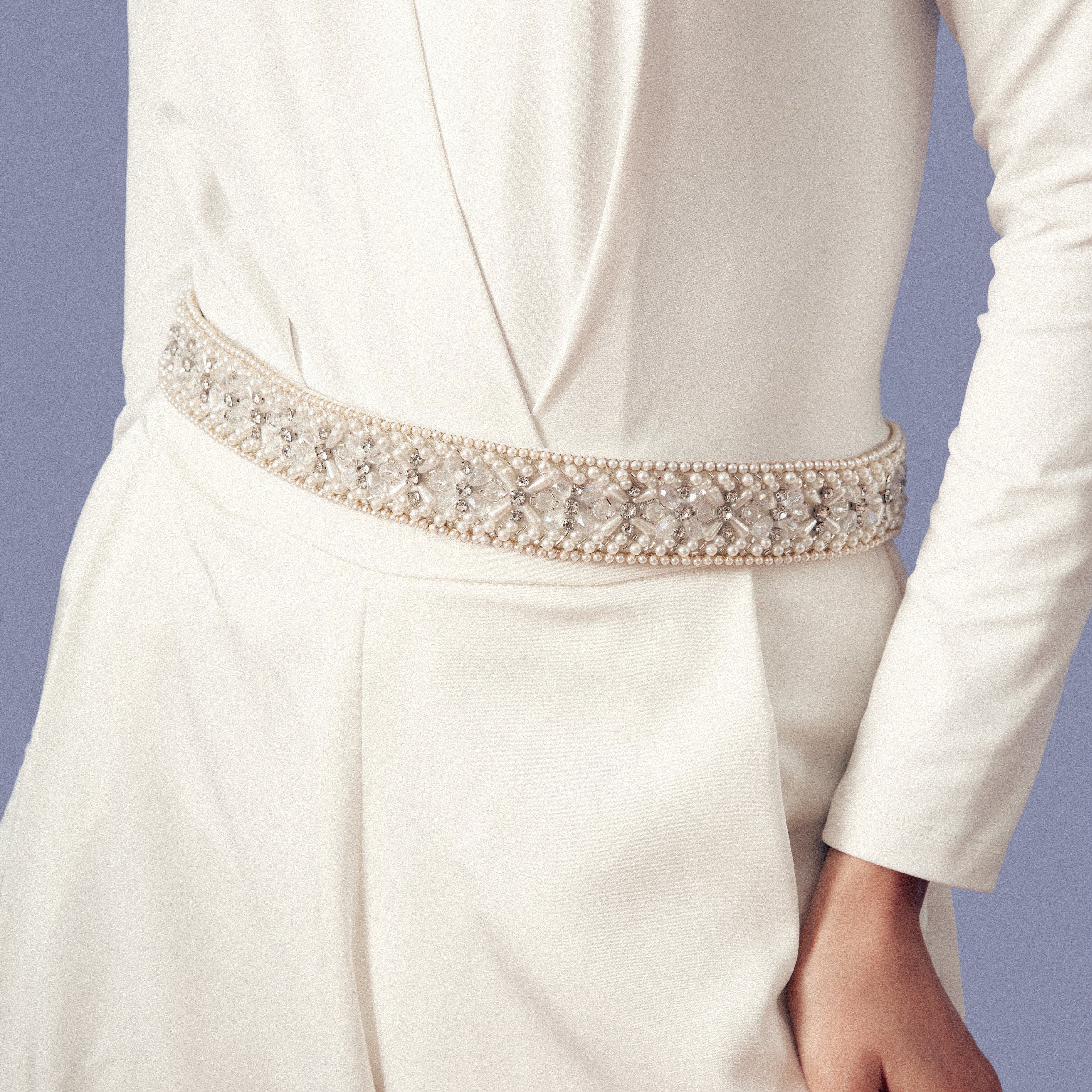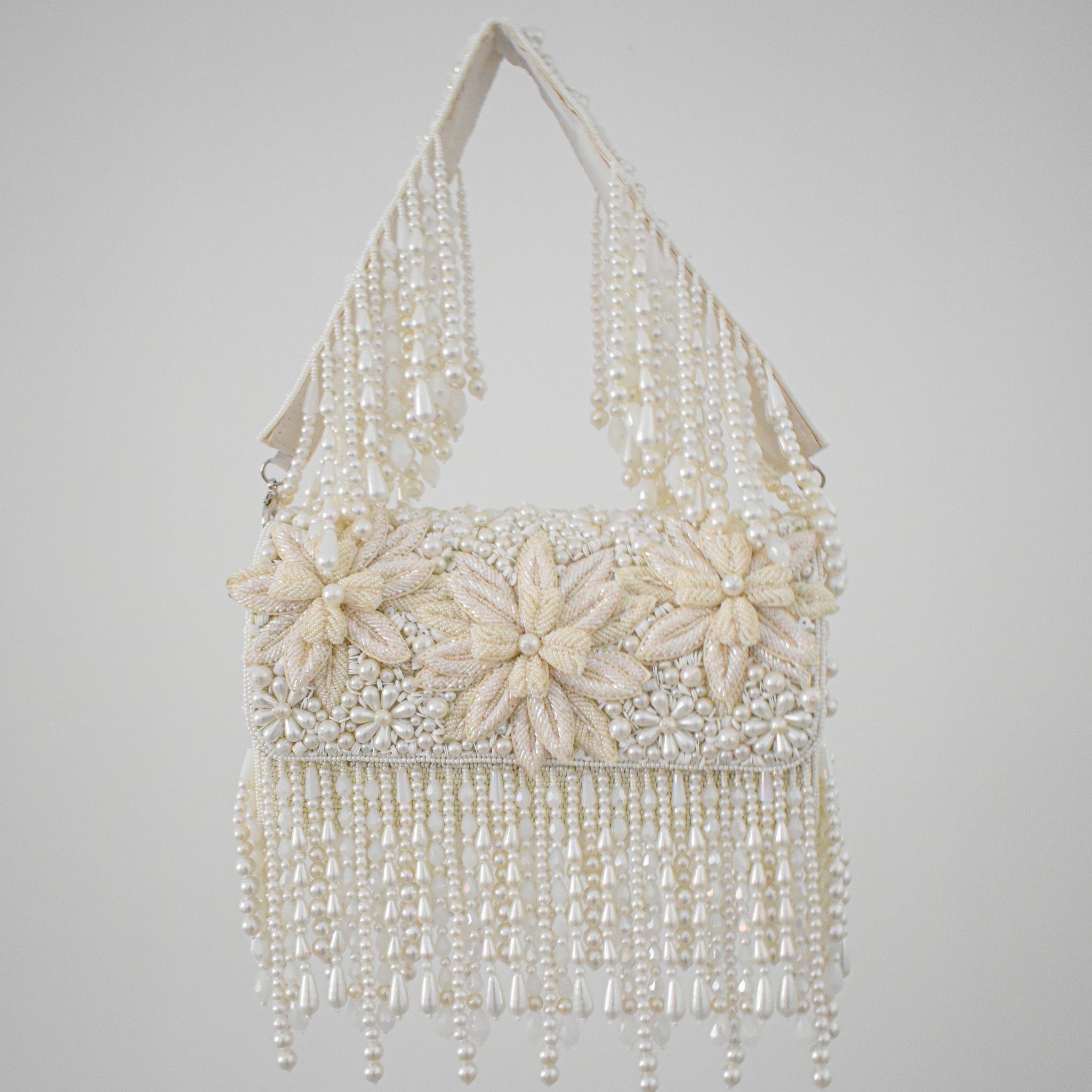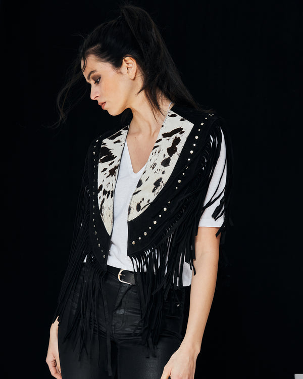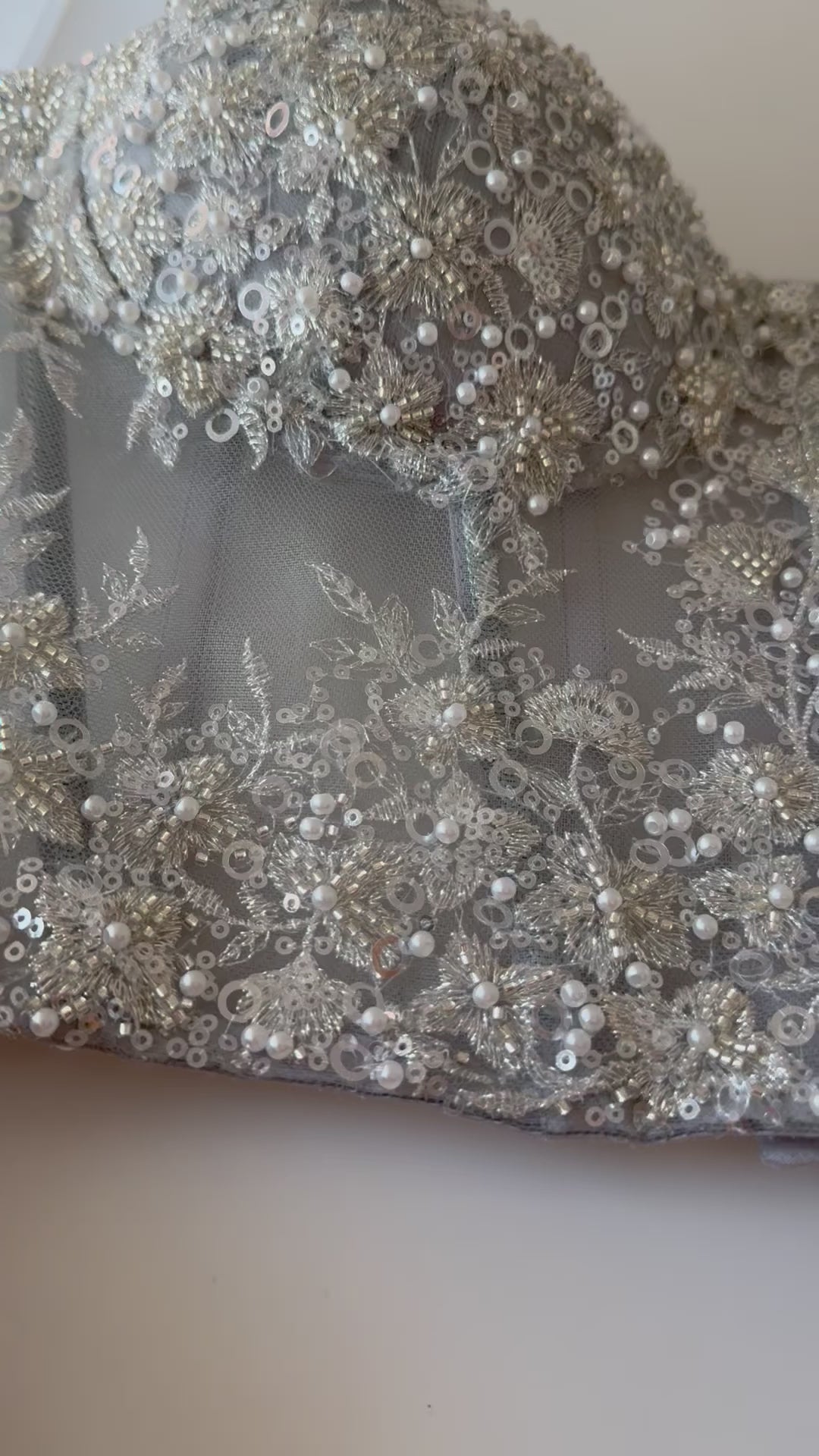 Capa artesanal bordada a mano con pedrería plateada sobre base de tul negro y formas paisley que se despliegan como un verdadero tapiz de lujo. Su silueta corta se realza con largas cascadas de mostacillas y flecos de cristal que caen desde los hombros y el contorno, aportando movimiento y brillo en cada paso. El cuello alto bordado en pedrería completa una pieza imponente, pensada para transformar un vestido simple en un look de alta costura.